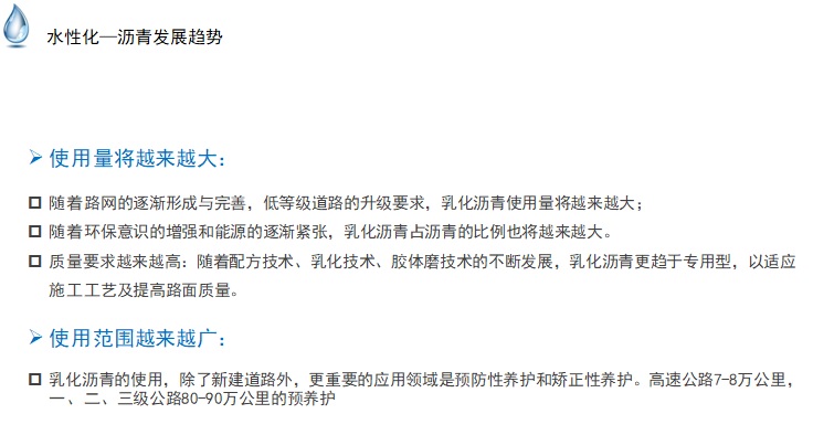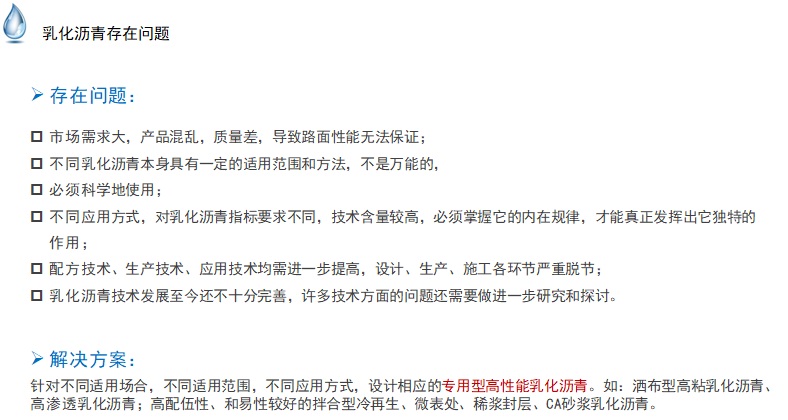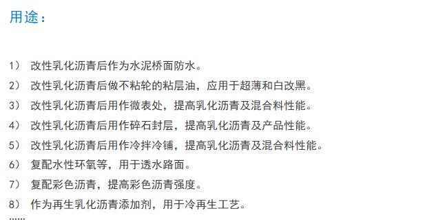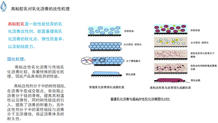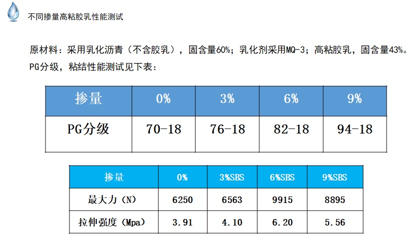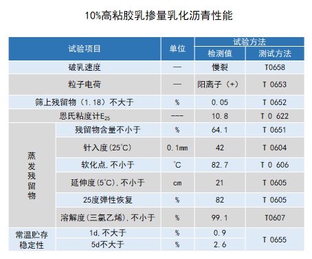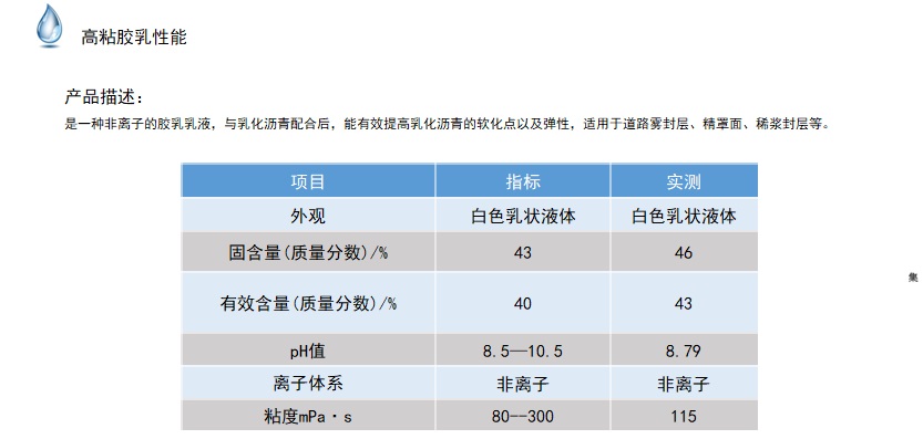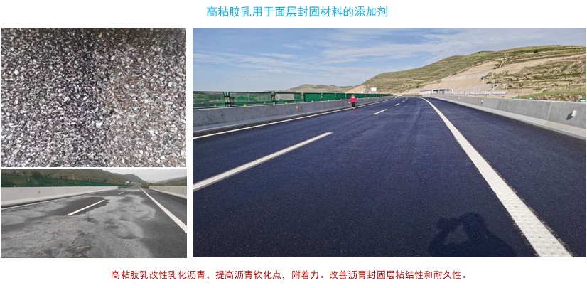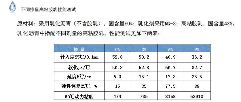 高粘胶乳为我公司独有技术研发生产的水性环保型乳化沥青改性剂,可全面提高乳化沥青性能。广泛应用于不粘轮粘层油,精表处,碎石封层,冷拌冷铺等领域。